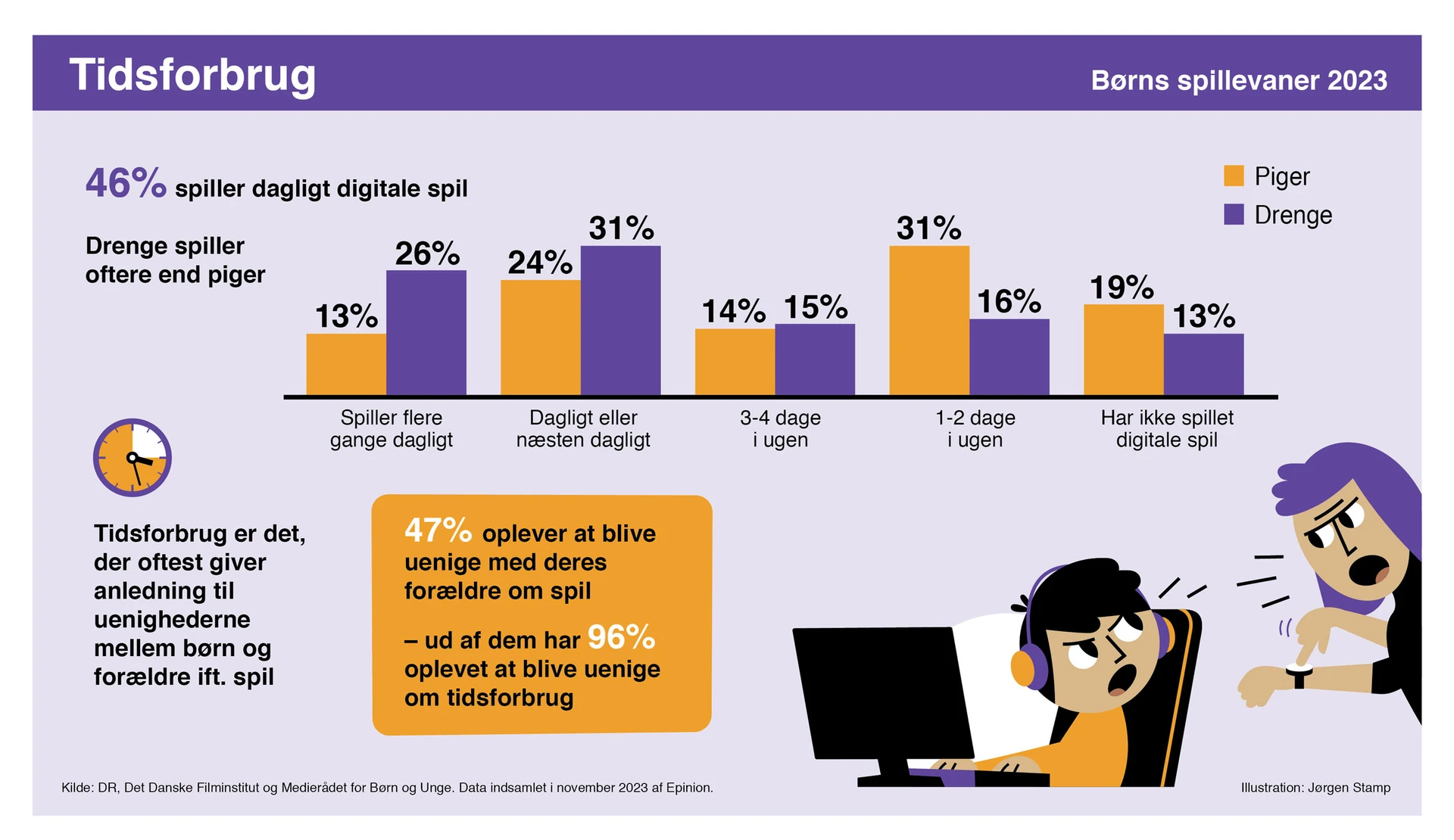 Gaming er en integreret del af danske børns hverdag. Faktisk er det 46% af danske børn og unge i alderen 1-15 år, der dagligt eller næsten dagligt spiller digitale spil. Det viser en ny undersøgelse af børn og unges digitale spillevaner, som er foretaget af Medierådet for Børn og Unge, DR og Det Danske Filminstitut.